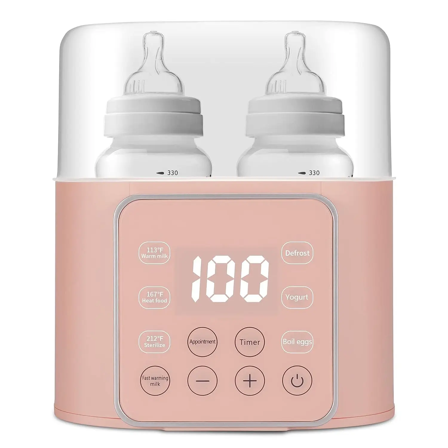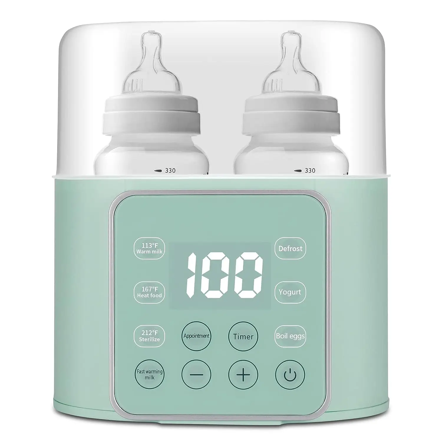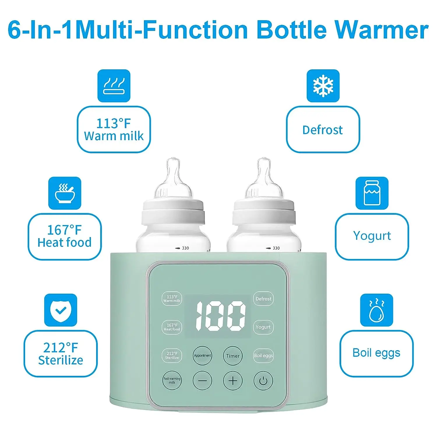 1. 4-in-1 Multifunction, 45℃ Warm Milk, 55℃ Defrost, 75℃ Warm Formula, 100℃ Sterilize 2. Large Capacity, Hold for 2 Bottles