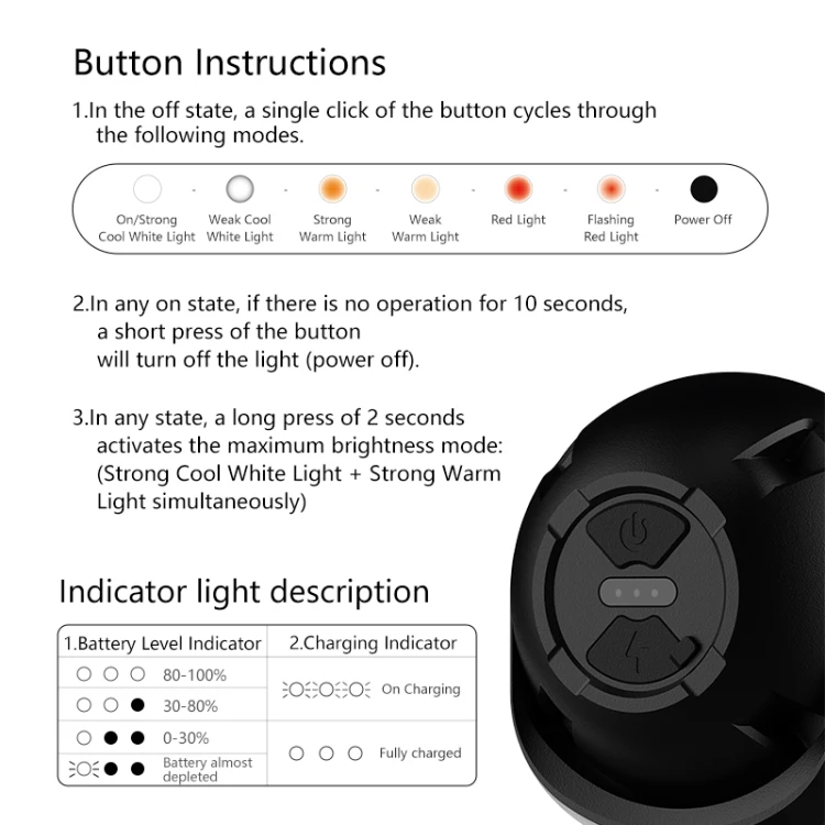 6. Lighting mode: strong white light-weak white light-strong warm light-weak warm light-red light-red light flashing