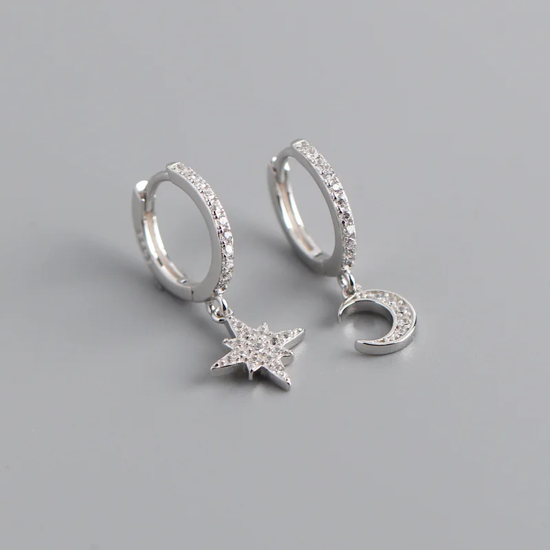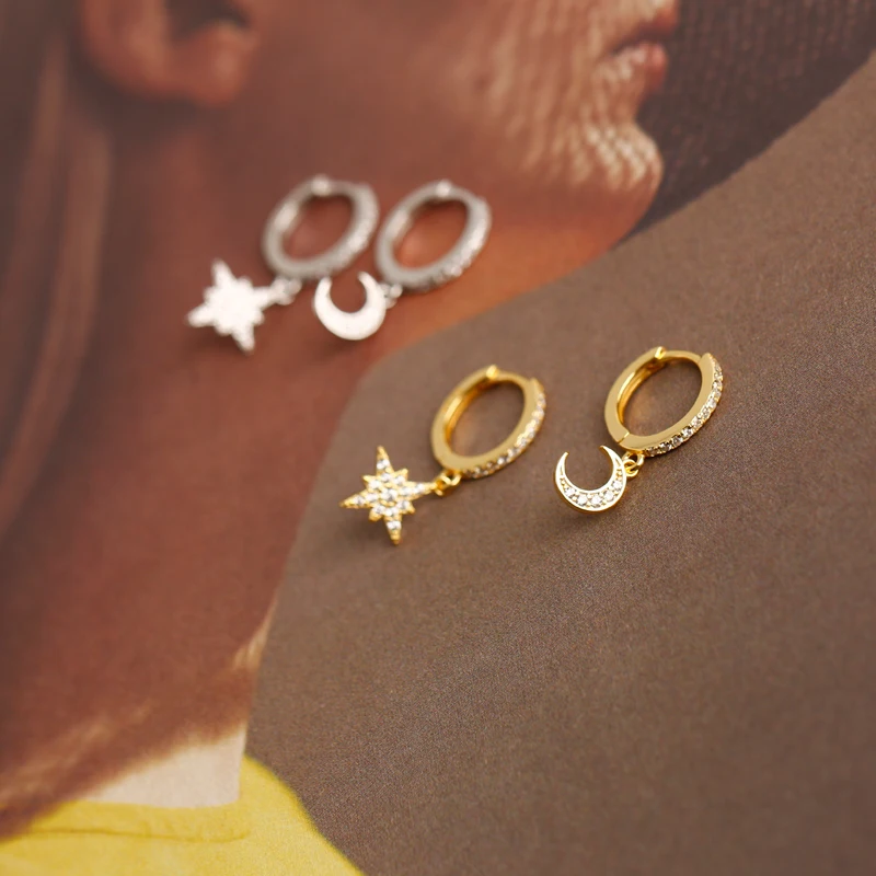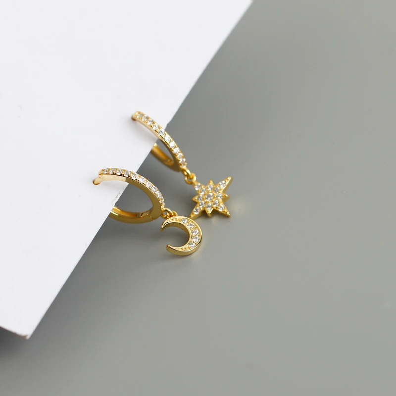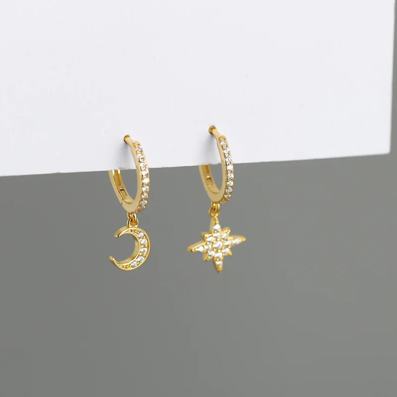 2022 NEW 925 Sterling Silver INS Star and Moon Shape CZ gold plated hoop earrings for women