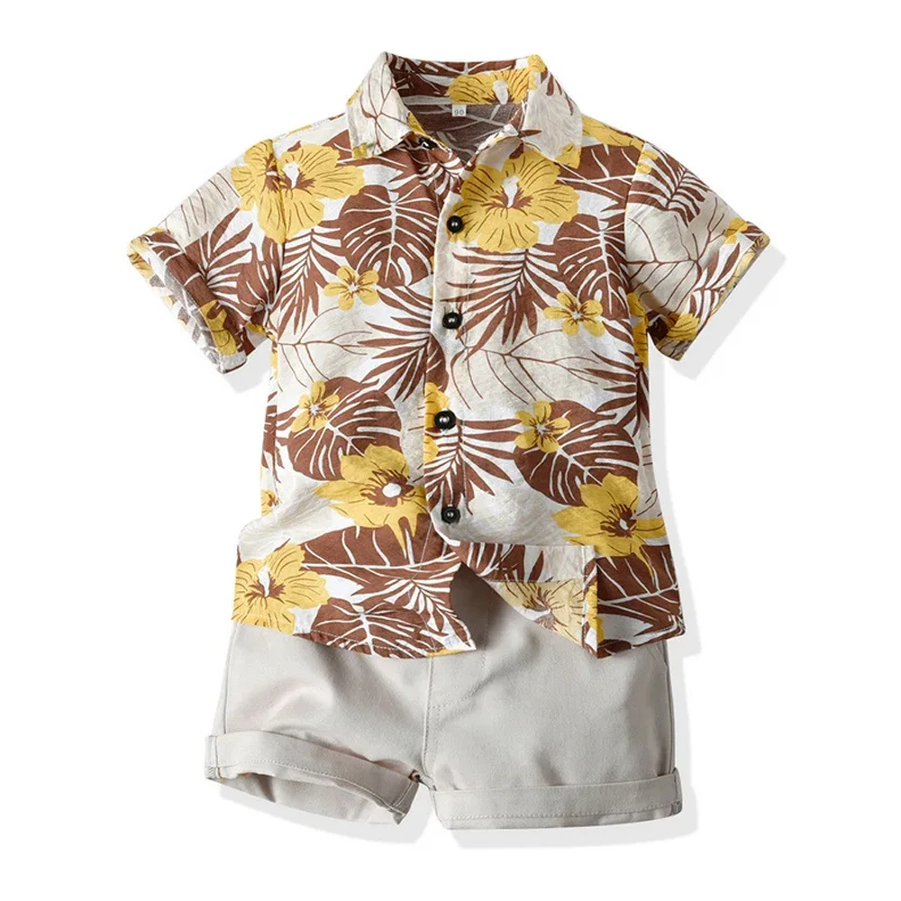 New Arrive Boy Kids Summer Shirt + Shorts Sets Leaf Printing Clothing Children’s Cotton Short Sleeve Button Casual Suits