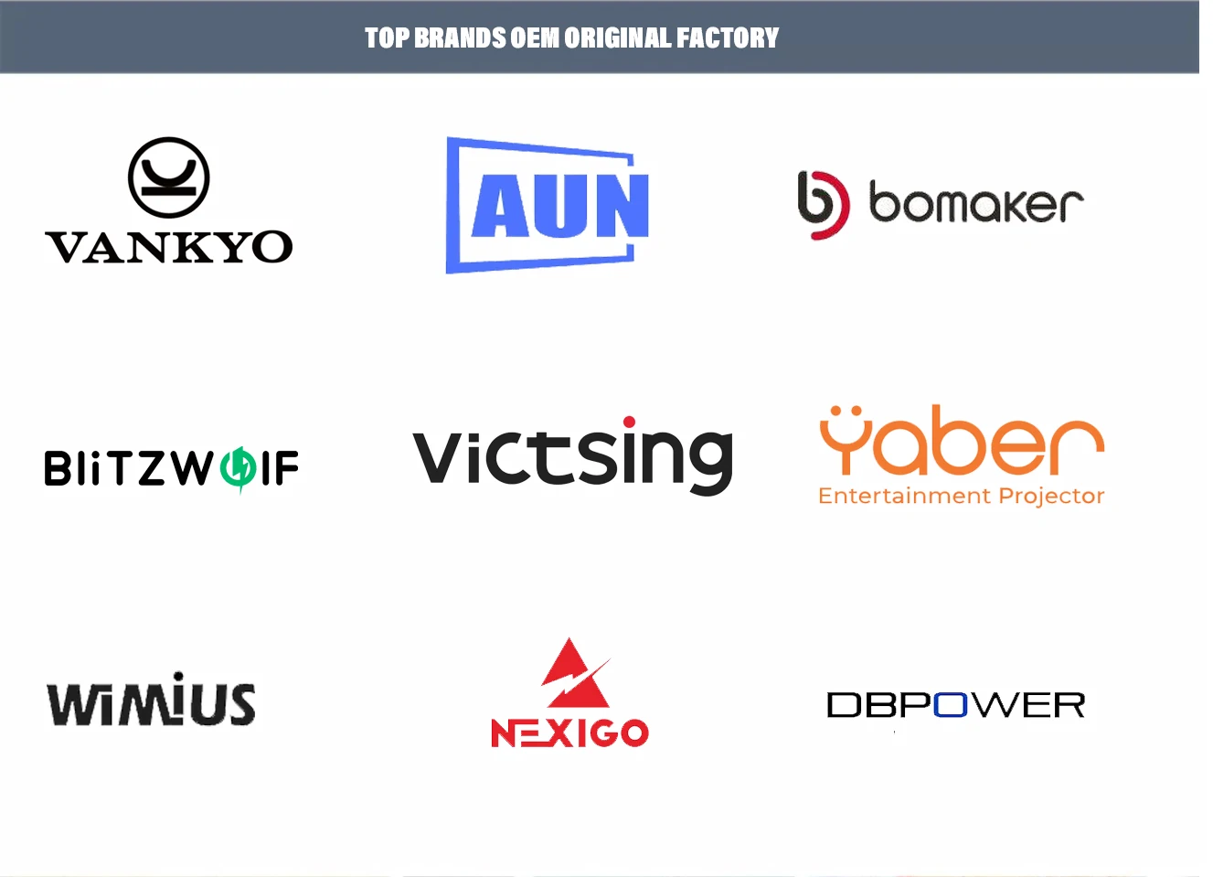 B:OEM For Popular Brands With more than ten years of mature brand development experience, better market operation experience, better product after-sales service, software and hardware upgrade experience, one-stop service, including manuals, color boxes, custom bottom stickers, and even FBA. Warehouse, trained Amazon, Walmart, AliExpress top brands: Vankyo, Wimius, Apeman, Nexigo and etc: