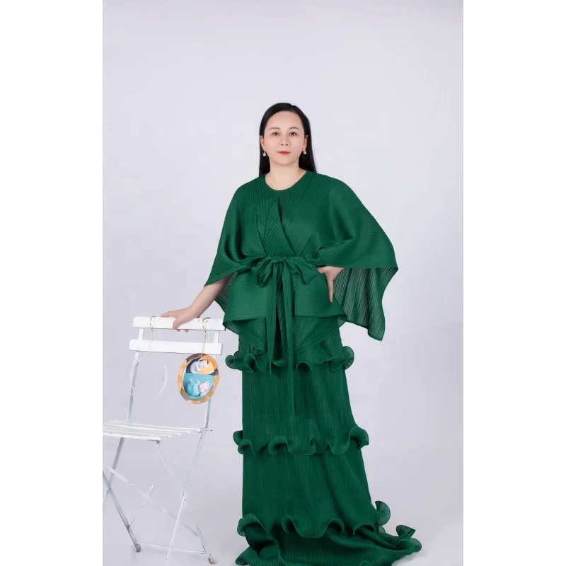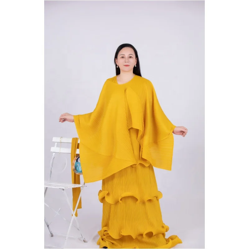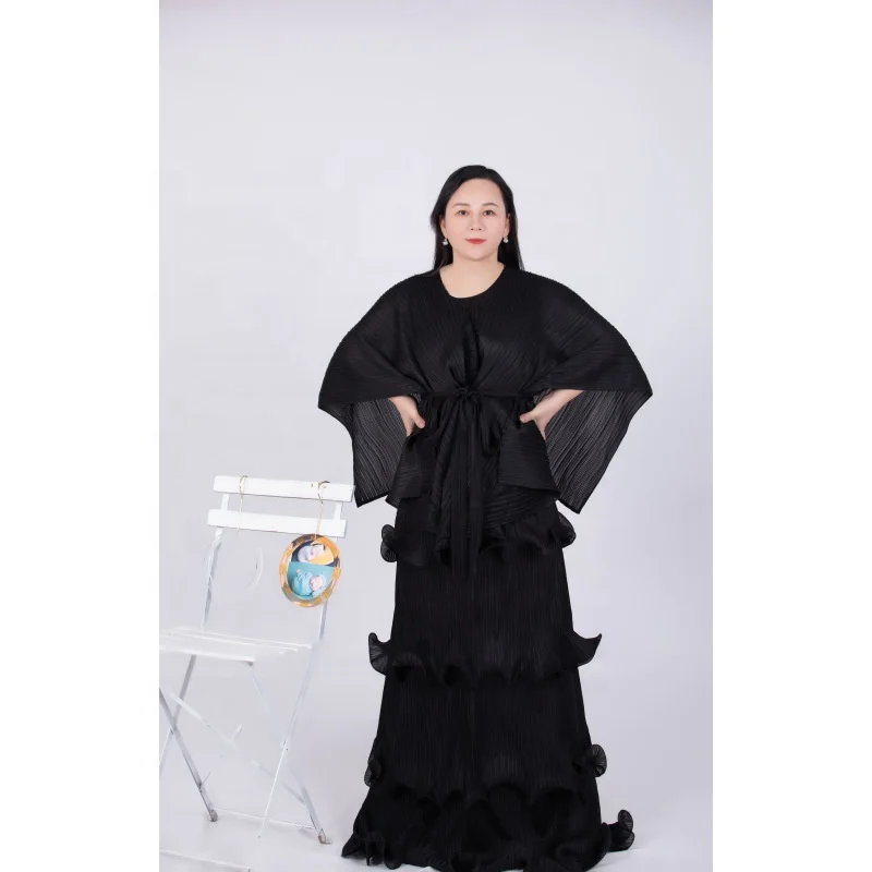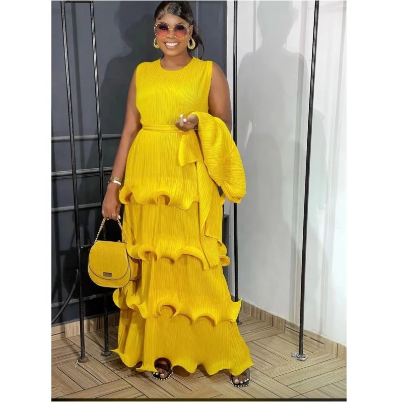 OUDINA New Solid Color Sleeveless Round Neck Two Piece Sets Pleated Plus Size Clothing Women's Dresses