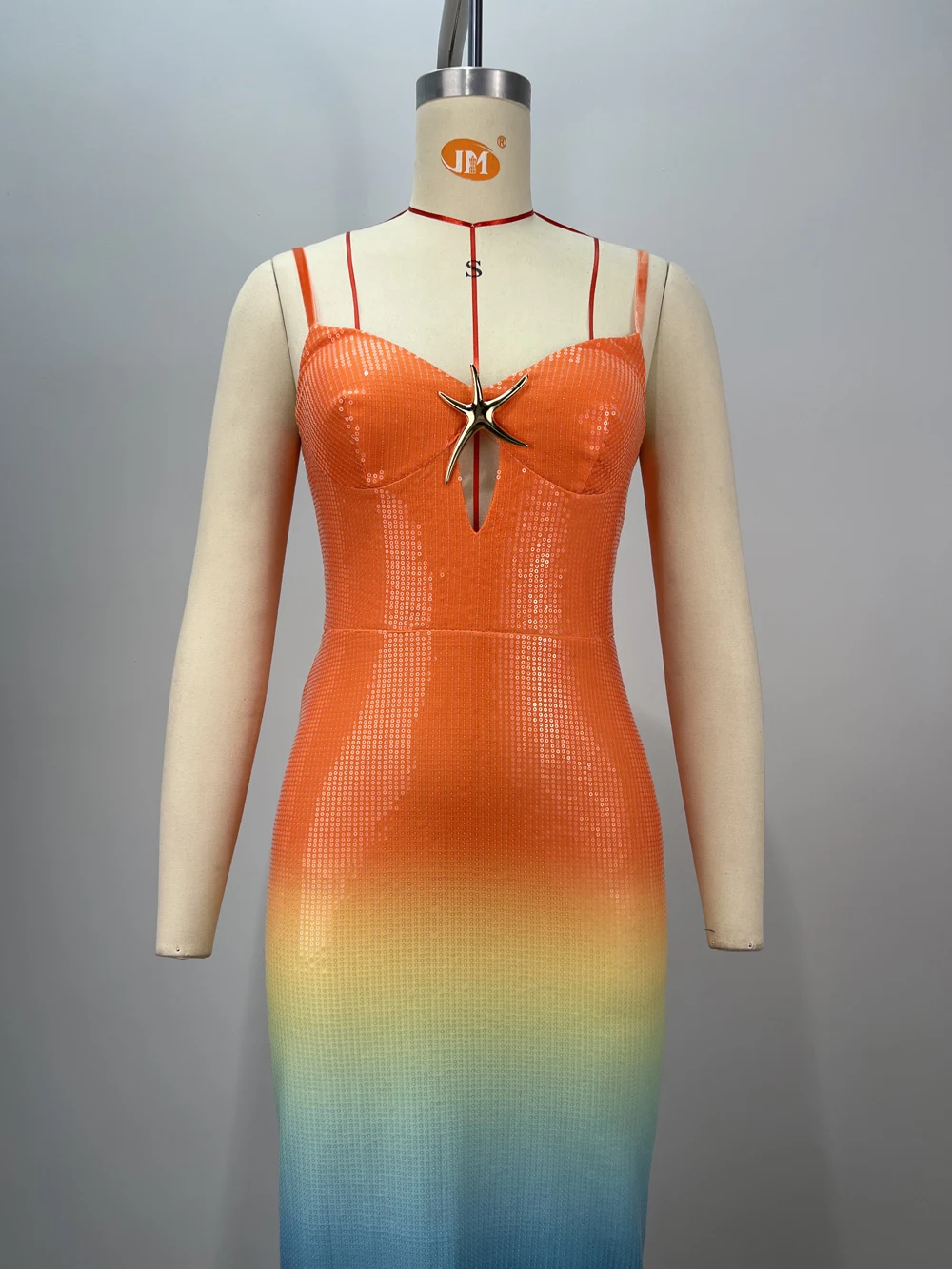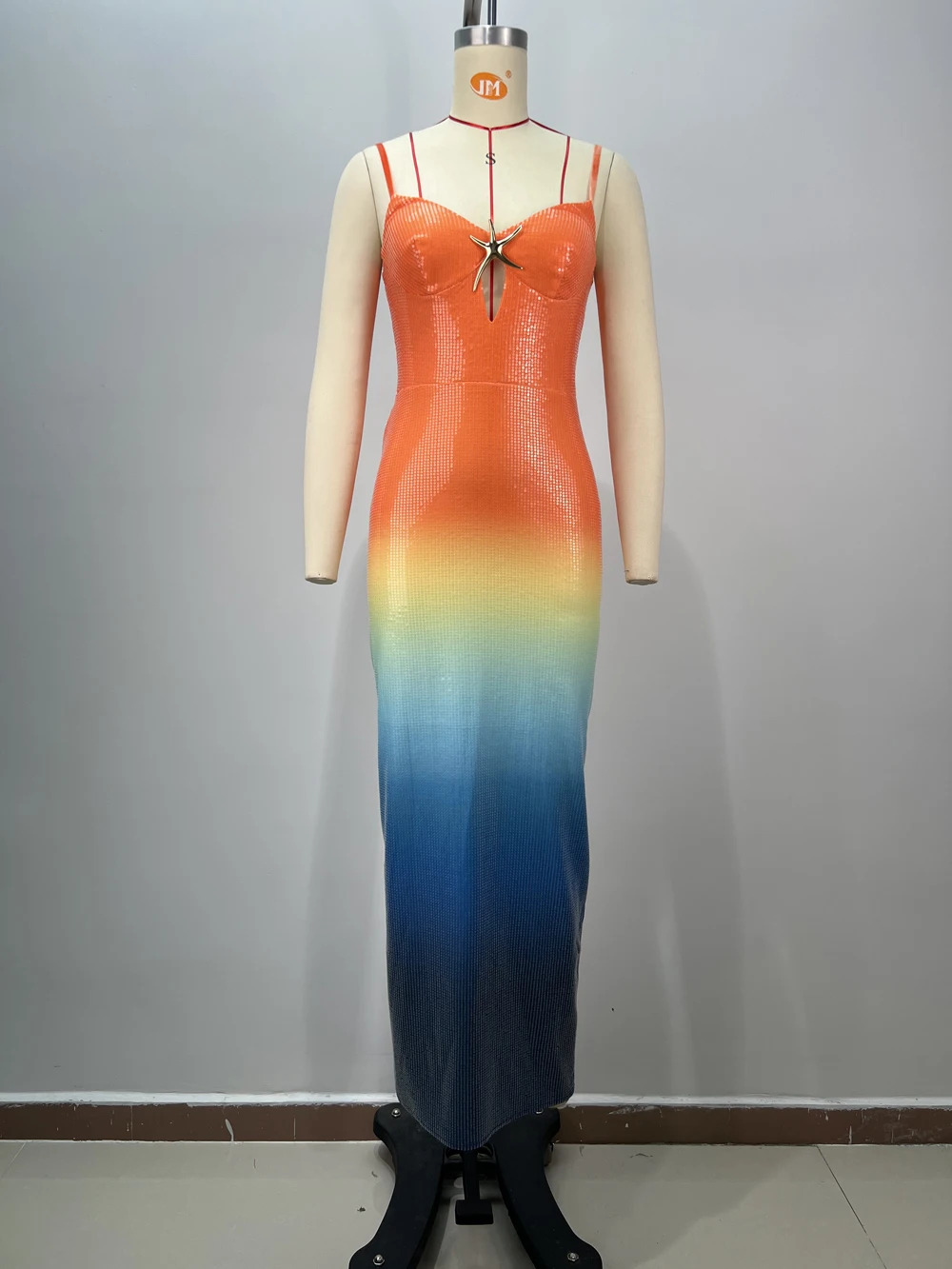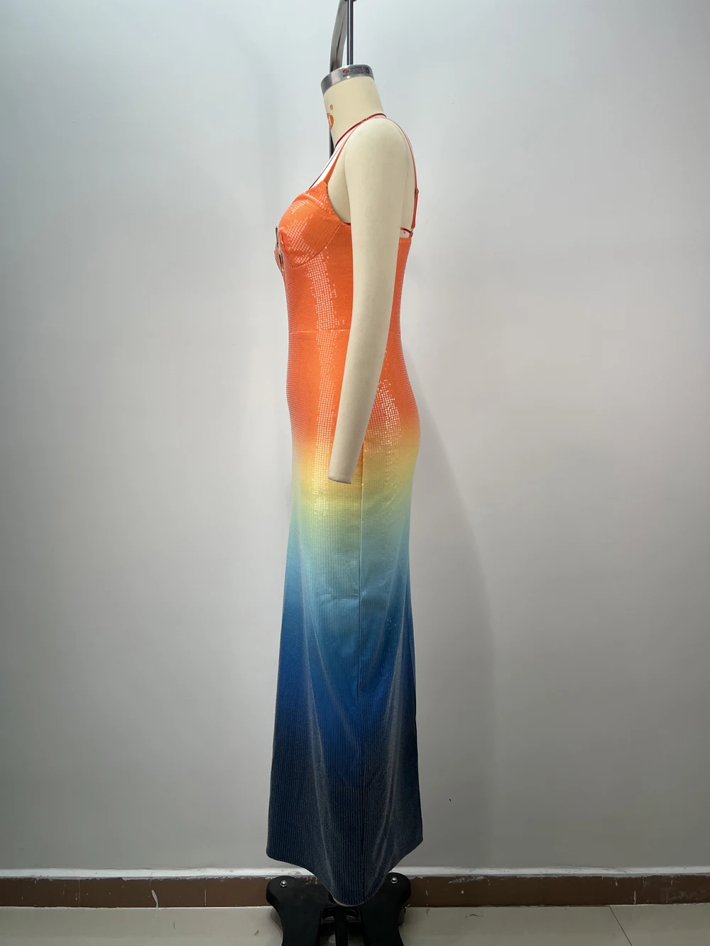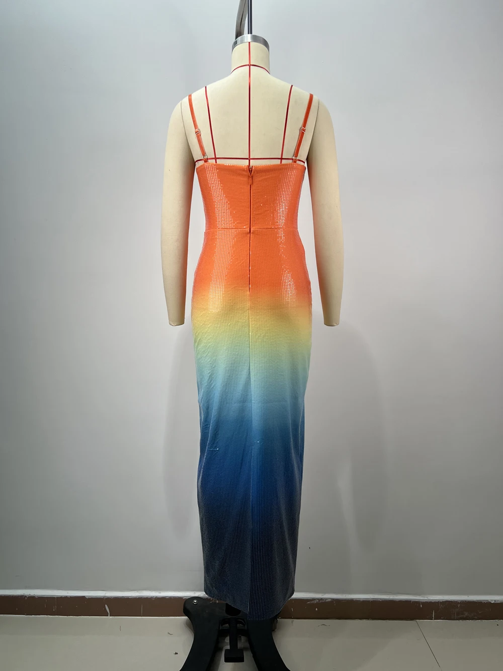 Wholesale Clothing Women’s Elegant Sexy Gradient Strap Sequined Long Dresses Prom Dress