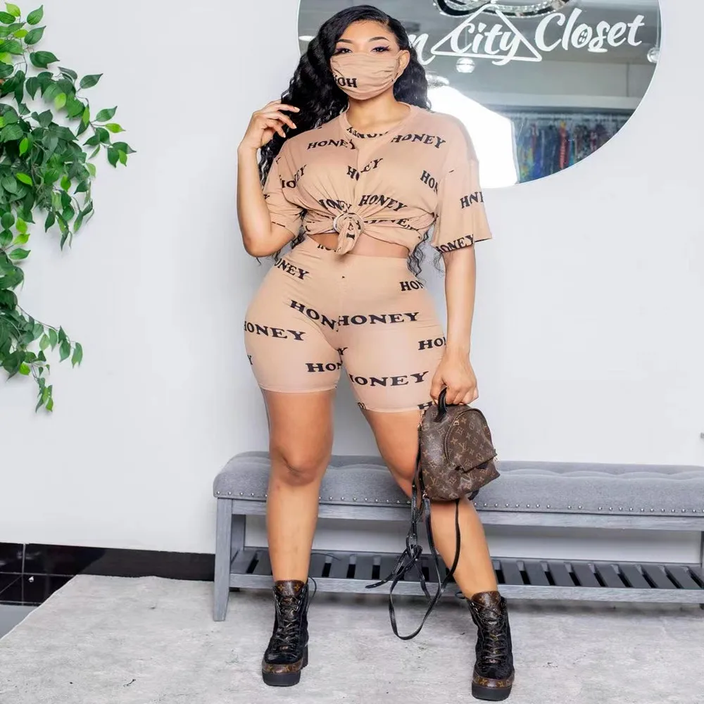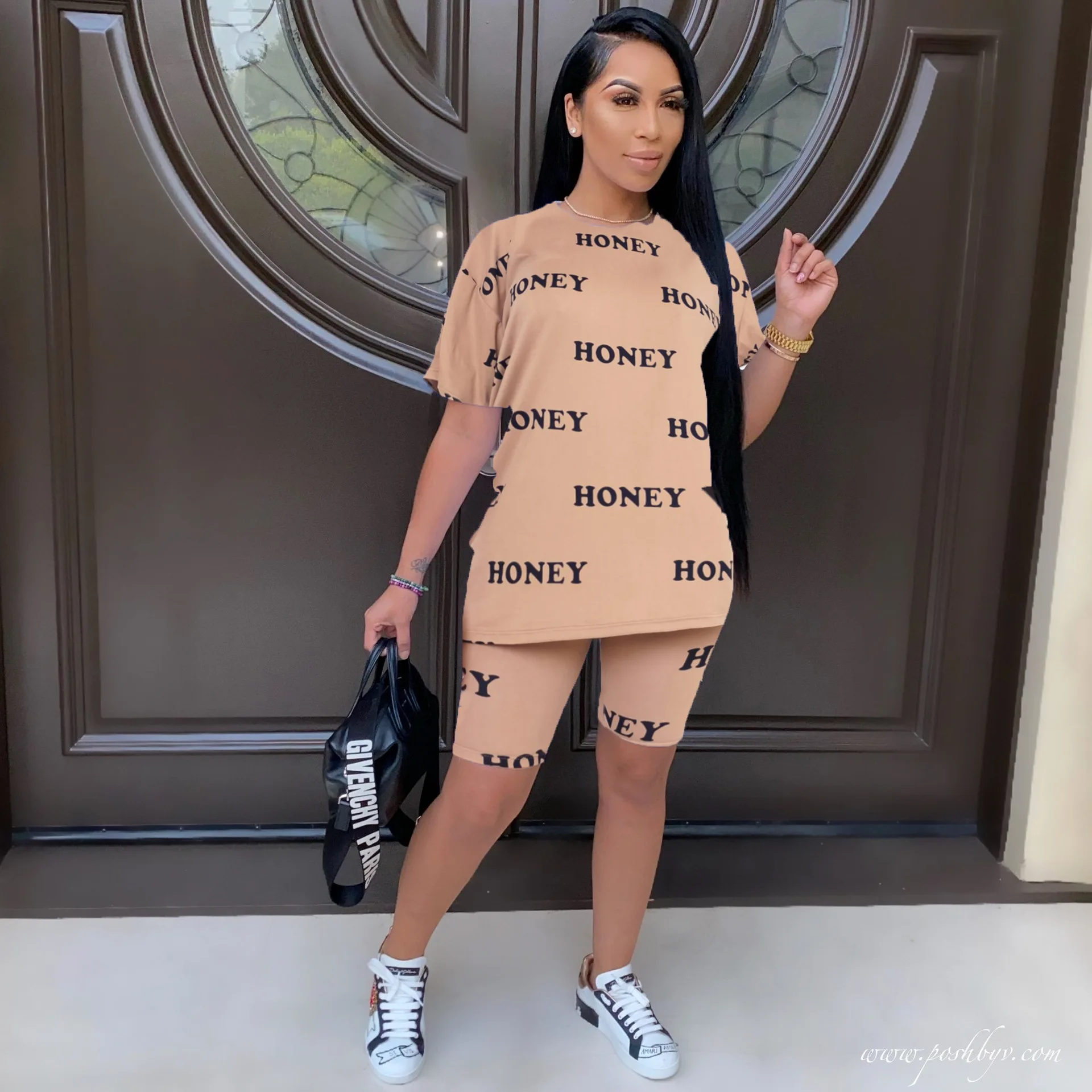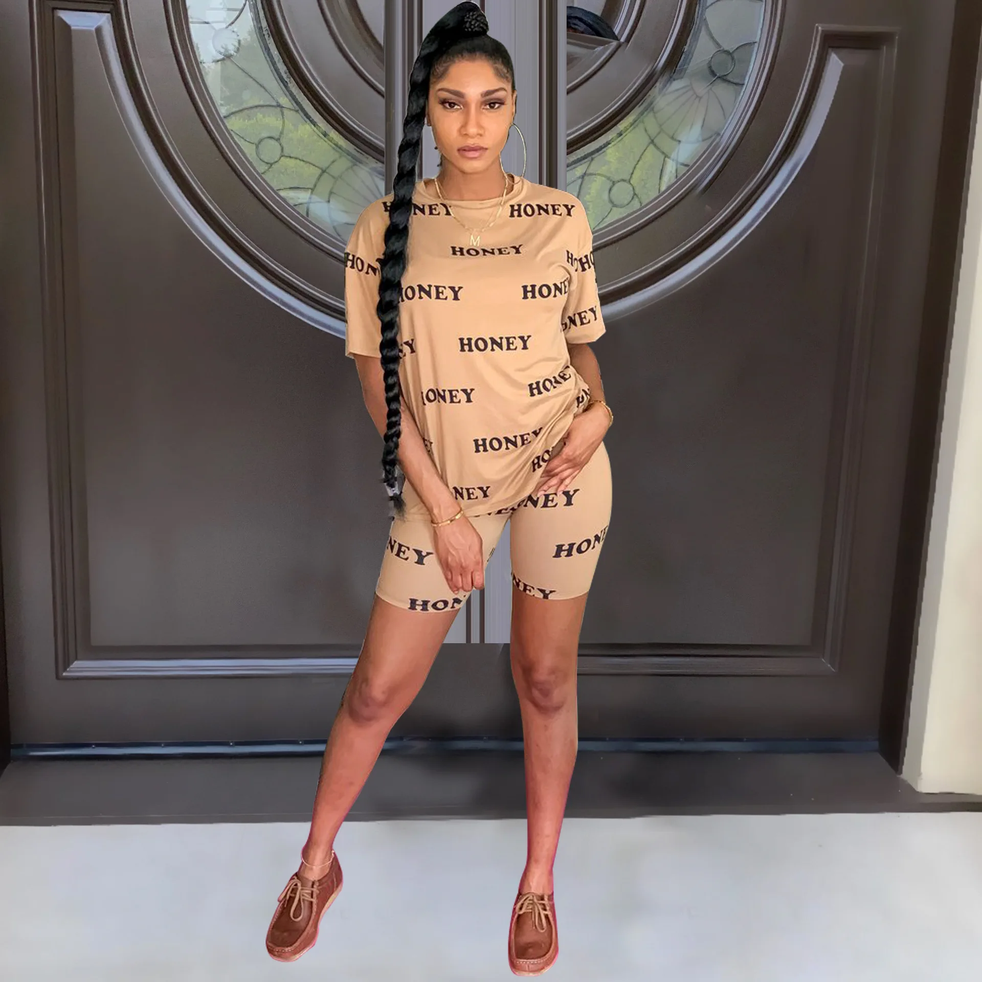 Wholesale Ladies Clothing Casual Fashion Women’s Print English Pattern Sports Two Piece Cycling Shorts Set