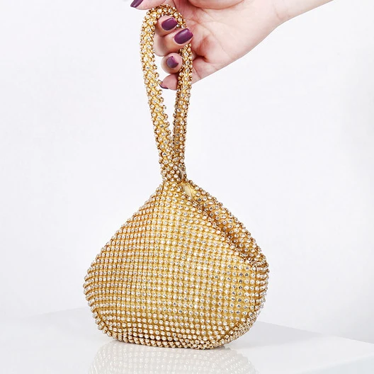 * Fashion and Vintage: handbags for women hand-Made fully beaded rhinestones, softer satin lining, Luxury full aluminum sequins peach shape clutch bag.